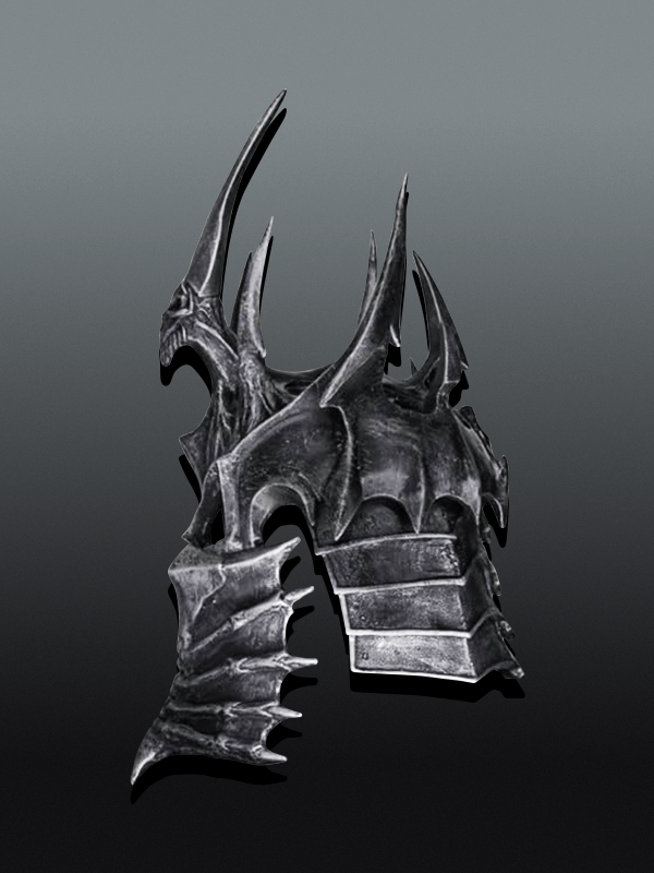 Crafted as a true 1:1 wearable prop, this helmet is made from premium polystone resin, offering exceptional durability while maintaining fine sculpted detail. The surface features a meticulously finished, weathered metal look that captures the cursed, battle-worn aesthetic associated with the Lich King. From the menacing skull-shaped faceplate to the imposing vertical crown extensions, the design radiates intimidation from every angle.